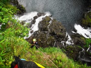 J’ai besoin d’un volontaire qui descend en rappel dans directement dans l’eau, au milieu des résurgences de la cascade Grand galet pour nous accrocher la corde 85 mètres plus bas, que je vais tendre avec l’aide du reste du groupe (c’est un sport d’équipe !). Une fois cette corde installée, j’envois une seconde corde qui va nous permettre de descendre en rappel pour finaliser l’installation. Tout est en place, les cordes permettent la descente en rappel de cette cascade incroyable d’une seul fois. C’est une installation spécifique aux canyons de la Réunion, elle est technique et demande une certaine expérience dans la pratique et l’encadrement du canyoning.